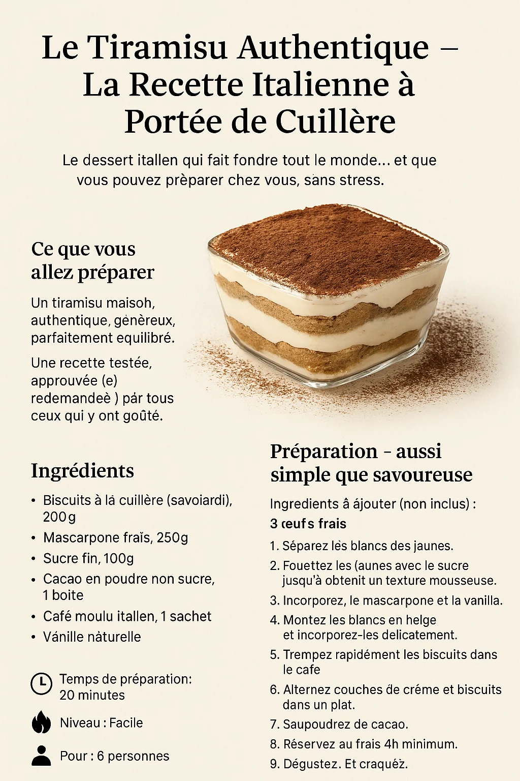 Pas besoin d’être un chef italien pour réussir cette recette.Avec notre fiche pas-à-pas et les bons ingrédients, vous allez créer un dessert digne des meilleures trattorias. Pour cela, veillez à :